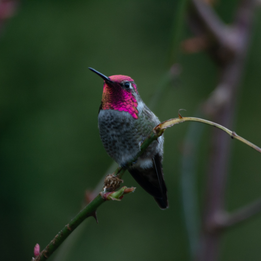 I watched Squeaky “metamorphose” over the course of summer. That is entirely the wrong word: hummingbirds of course do not metamorphose. They simply moult their feathers and acquire their adult plumage. But the transformation from a subtle and understated, fairly camouflaged green juvenile to the ostentatious metallic red of an adult male Anna’s hummingbird seems so parallel to that of a simple caterpillar changing into a colourful butterfly that I think of it as a metamorphosis.