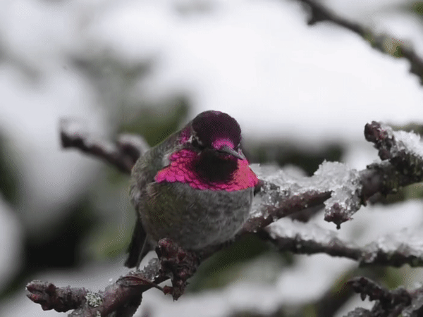 The hummingbirds split their time between aggressively chasing one another around (to warm up, I guess?) and sitting very still, fluffing up their downy feathers to hold heat in.